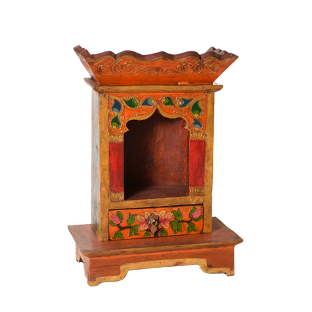 Our Tibetan wooden shrine is a delicately hand painted shrine that is commonly used in Nepal to display statues in the family home or in a monastery. It is very common to have these shrines at nepalese and Tibetan homes, Personal deities are kept inside the Alter / Shrine.
